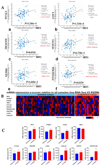 Correlation analysis of IRF3 expression with the immune checkpoints in TCGA MESO. (A). IRF3 gene expression correlated with the immune checkpoint genes expression: (a) CTLA4 (CD152); (b) LAG3; (c) HAVCR2 (TIM-3); (d) LGALS1 (Galectin); (e) PDCD1 (PD-1); (f) PDCD1LG2 (PD-L2). The correlation curves were generated automatically by the online program when importing the gene name of interest. The name of both axes is mRNA expression, RSEM (batch normalized from Illumina HiSeq_RNASeqV2). For all X axes, the name is IRF3, the difference is Y axis as shown by gene names. (B). Heat map of mRNA expression of cGAS/STING signaling pathway and immune checkpoint genes in epithelioid vs. non-epithelioid subtypes of MESO. (C). Quantification of cGAS/STING signaling pathway and immune checkpoint genes in epithelioid vs. non-epithelioid subtypes of MESO. *, p < 0.05; ***, p < 0.001, unpaired t test.