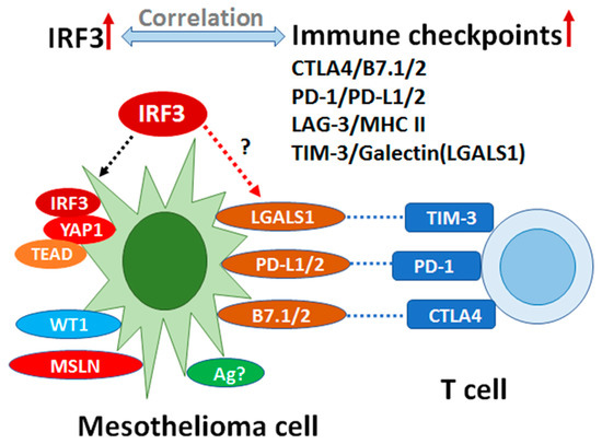 Mesothelin (MSLN), Wilm’s tumor protein WT1 and YAP1, which are well-known tumor markers in mesothelioma cells, have been applied as therapeutic targets and prognostic indicators. In this study, IRF3 knockout resulted in tumor rejection partially or completely, suggesting that IRF3 may play a critical role in immunosuppression. Correlation of IRF3 with the immune checkpoints in TCGA MESO and coexpression with LGALS1 in scRNA-Seq data from our patient samples imply that IRF3 may be an inhibitory transcription regulator in mesothelioma (Figure 7). Targeting IRF3, which was shown to be a YAP agonist target against gastric cancer, may work similarly in MESO [51]. Overexpression of LGALS1 (Galectin-1) suggests that targeting galectin-1 may inhibit cancer progression by modulating immunosuppressive microenvironment [52]. Galectin-1 can foster an immunosuppressive microenvironment by reprogramming CD8+ regulatory T cells and promoting immunotherapy resistance [53,54]. However, other studies have presented different findings demonstrating that IRF3 may be protective against colonic tumorigenesis in particular [55].