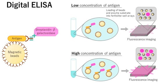 - Akama, K.; Iwanaga, N.; Yamawaki, K.; Okuda, M.; Jain, K.; Ueno, H.; Soga, N.; Minagawa, Y.; Noji, H. Wash- and amplification-free digital immunoassay based on single-particle motion analysis. ACS Nano 2019, 13, 13116–13126. [Google Scholar] [CrossRef] [PubMed]
