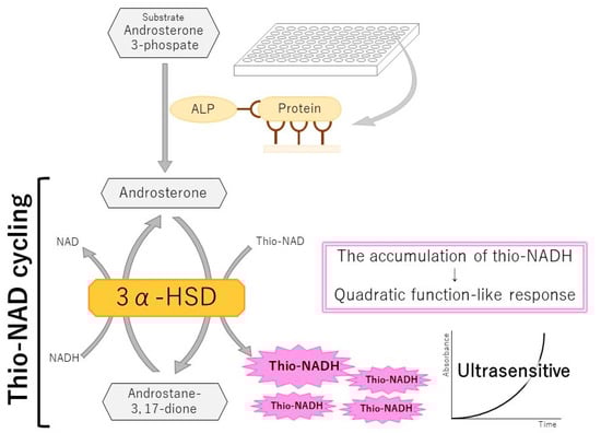 - Watabe, S.; Kodama, H.; Kaneda, M.; Morikawa, M.; Nakaishi, K.; Yoshimura, T.; Iwai, A.; Miura, T.; Ito, E. Ultrasensitive enzyme-linked immunosorbent assay (ELISA) of proteins by combination with the thio-NAD cycling method. Biophysics 2014, 10, 49–54. [Google Scholar] [CrossRef] [PubMed]