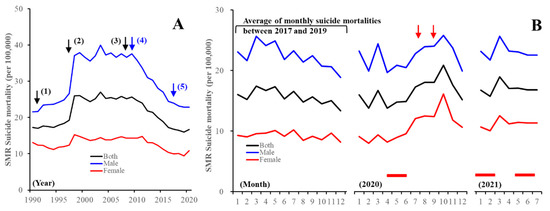 (A) Annual and (B) monthly suicide mortality in Japan. Ordinates indicate standardised mortality ratio (SMR) of suicide mortality of males and females (black lines), males (blue line), and females (red line) in Japan per 100,000 people. (A) Black arrows (1–3) indicate the collapse of the asset bubble, the Asian economic crisis, and the 2008 global financial crisis, respectively. Blue arrows (4) and (5) indicate the contribution of the Emergency Fund to Enhance Community-Based Suicide Countermeasures and the introduction of the Revised Basic Act on Suicide Prevention, respectively. (B) (left) Average SMR suicide mortalities during 2017–2019. (middle, right) Monthly SMR suicide mortality in 2020 and 2021, respectively. Red columns, period of 2019 novel coronavirus disease (COVID-19) stay-home orders; red arrows, mass media reports regarding celebrity suicides.