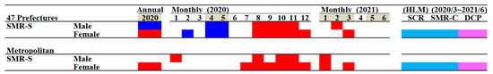 Linear mixed-effect models detected the significantly different annual and monthly SMR-S of all 47 prefectures between COVID-19 pre-pandemic (between 2017 and 2019) and pandemic (between 2020 and 2021) periods. In all 47 prefectures, the annual SMR-S of females was increased in 2020, but that of males was decreased compared to average SMR-S during the pre-pandemic period (Figure 2 and Figure 3). In 2020, the monthly SMR-S of males and females decreased during the first stay-home order (between April and May 2020) compared to the average SMR-S at the same month during the pre-pandemic period (Table 1, Figure 2 and Figure 3). The monthly SMR-S of both males and females increased between the first and second stay-home orders (between August and December 2020) compared to the average SMR-S in the same month during the pre-pandemic period (Table 1, Figure 2 and Figure 3). In 2021, the trends of the monthly SMR-S of males and females were different from those in 2020. The SMR-S of both males and females during the second stay-home order (between January and March 2021) increased, but there were no differences in that of both males and females during the third stay-home order (between May and July 2021) compared to the pre-pandemic period (Table 1, Figure 2 and Figure 3).