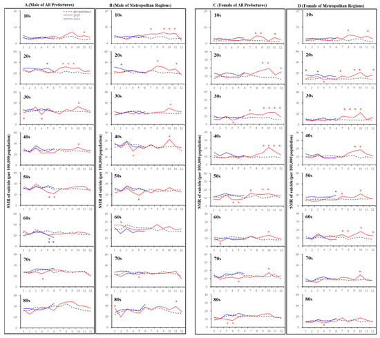 Temporal fluctuations in monthly SMR-S disaggregated by gender, age, and regional factors during the COVID-19 pandemic period (2020–2021) compared to the average of SMR-S during the same month during the pre-pandemic period (2017–2019). Dotted black, red, and blue lines indicate the average of SMR-S for (A) males from all 47 prefectures, (B) males from metropolitan regions, (C) females from all 47 prefectures, and (D) females from metropolitan regions. Ordinates indicate the SMR-S (per 100,000 people), and abscissas indicate the month. * p < 0.05, significant change using a linear mixed-effects model with Tukey’s multiple comparison. Red and blue asterisks indicate significant changes in SMR-S in 2020 and 2021, respectively, compared to the average SMR-S of the same month during the pre-pandemic period.