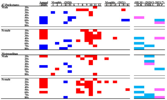 In SMR-S disaggregated by only the gender factor, the polarised responses of SMR-S to COVID-19-related data, SCR, SMR-C, and DCP were slightly weakened, using SMR-S disaggregated by gender with age factors by the hierarchical linear model (Figure 5). A positive relationship between SMR-S and DCP was still detected in females over 30 in all 47 prefectures, whereas a negative impact of SCR and SMR-C on SMR-S was not detected in females except for those in their 70s (Figure 5). Furthermore, in metropolitan regions, a positive impact of DCP on SMR-S was detected in only females in their 40s and 80s, whereas a negative impact of SCR and SMR-C on SMR-S was detected in females in their 60s–80s. In all 47 prefectures and metropolitan regions, a significant responsiveness of males’ SMR-S to COVID-19-related data, SCR, SMR-C, and DCP was also detected, but with less consistent results (Figure 5). Nevertheless, the impact of COVID-19-related data, SCR, SMR-C, and DCP on the SMR-S of males was negligible compared to that of females.
