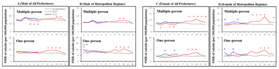 Temporal fluctuations in monthly SMR-S disaggregated by gender, household condition, and regional factors during the COVID-19 pandemic period (2020–2021) compared to the average of SMR-S for the same month during the pre-pandemic period (2017–2019). Dotted black, red, and blue lines indicate the average of SMR-S for (A) males from all 47 prefectures, (B) males from metropolitan regions, (C) females from all 47 prefectures and (D) females from metropolitan regions. Ordinates indicate the SMR-S (per 100,000 people), and abscissas indicate the month. * p < 0.05, significant change using a linear mixed-effects model with Tukey’s multiple comparison. Red and blue asterisks indicate significant changes in SMR-S in 2020 and 2021, respectively, compared to the average SMR-S of the same month during the pre-pandemic period.