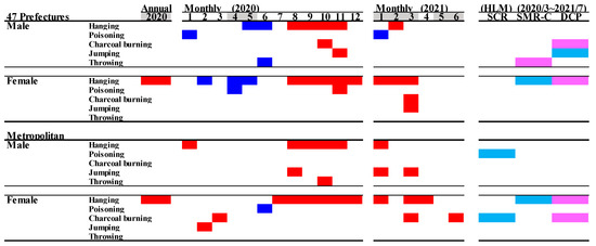 The 2019 novel coronavirus disease (COVID-19) had globally infected more than 242 million people and contributed to over 4.9 million deaths as of 25 October 2021 [1]. In Japan, more than 1.7 million people were infected with COVID-19, and more than 18,000 lives were lost due to COVID-19 as of 25 October 2021 [1,2]. Even today, when vaccines are more widespread, the COVID-19 pandemic continues. In addition to COVID-19-related health hazards, governmental COVID-19 restrictions have impacted lives and lifestyles, resulting in the deterioration of socioeconomic and sociopsychological status. A number of studies expressed sociopsychological concerns that the COVID-19 pandemic has encouraged isolation, fear, marginalisation, psychiatric disorders, domestic abuse, and intimate partner violence [3,4,5,6,7]. Social conditions that force the drastic modification of lifestyles and the economy play important roles in increasing suicide mortality [8,9]. Contrary to our expectations, a recent study revealed that the risk of suicide of 21 countries could not be detected during the early COVID-19 pandemic periods, including Japan [10]. However, an extended observation period reported that the prolongation of the COVID-19 pandemic periods increased suicide mortality in some countries and areas, such as Japan, Puerto Rico, and Vienna (Austria) [10].