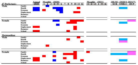 The SMR-S of females caused by economy-related motives in metropolitan regions was the sole increasing factor during the first stay-home order (Figure 10 and Figure 11). Therefore, we reanalysed the SMR-S of males and females disaggregated by five major motives. In all 47 prefectures, the SMR-S of males and females caused by economy-related motives was decreased during the first stay-home order, and increased between the first and second stay-home orders (Figure 12). In contrast, the SMR-S of males and females caused by economy-related motives was increased in May–June 2020 and January–February 2021 without decreasing in the other months (Figure 12).