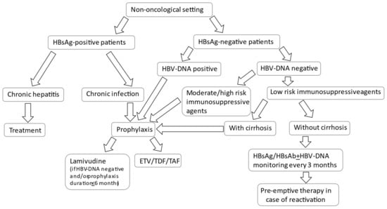 - Pisaturo, M.; Di Caprio, G.; Calò, F.; Portunato, F.; Martini, S.; Coppola, N. Management of HBV Reactivation in Non-Oncological Patients. Expert Rev. Anti-Infect. Ther. 2018, 16, 611–624. [Google Scholar] [CrossRef]