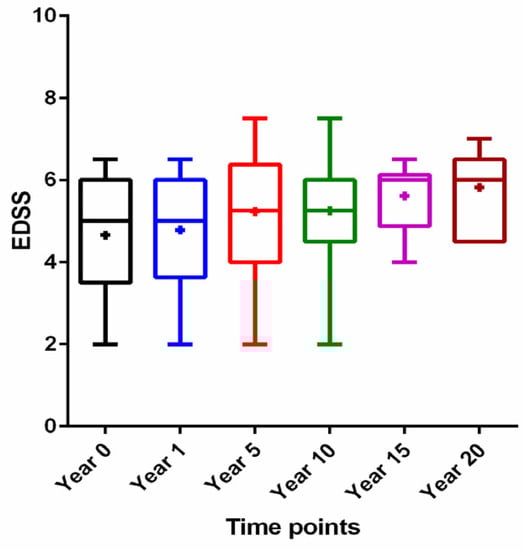 Expanded Disability Status Scale (EDSS) score over time: year 0 (at the cladribine induction treatment initiation), year 1 (at the end of cladribine induction treatment), year 5 (follow-up of 5 years), year 10 (follow-up of 10 years), year 15 (follow-up of 15 years), and year 20 (follow-up of 20 years). Data are presented as median (horizontal line), 25% interquartile range (box), range (whiskers), and means (middle cross).