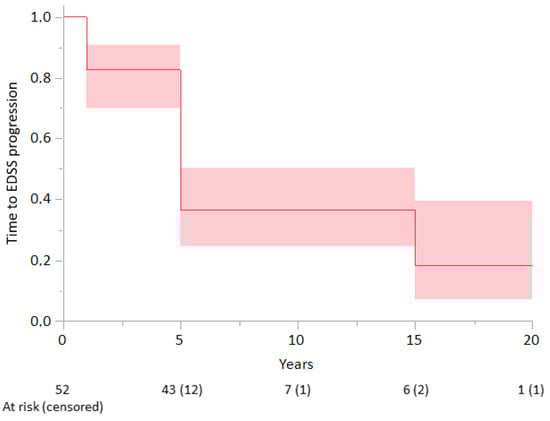 Time to Expanded Disability Status Scale (EDSS) score progression according to Kaplan–Meier analysis in the whole patient cohort (n = 52). The shading represents 95% confidence intervals.
