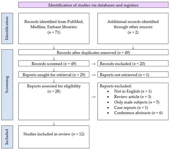 Seventy-three articles were identified and screened at the title and abstract levels. Forty-five articles were excluded for any of the following reasons: they were not in English, they were review articles or meta-analyses, only males were subjects of the research, they were case reports or they were conference abstracts, or there were no possibilities for analyzing the success rate of the treatment. Thus 12 articles [20,21,22,23,24,25,26,27,28,29,30,31,32], summarized in Table 1, Table 2, Table 3, Table 4 and Table 5, represented the object of this review.