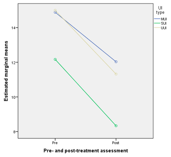 Profile plot of the two-way mixed model ANOVA marginal means of pre- and post-treatment assessment of ICIQ-UI SF scores. Abbreviations: MUI—mixed urinary incontinence, SUI—stress urinary incontinence, UUI—urgency urinary incontinence.