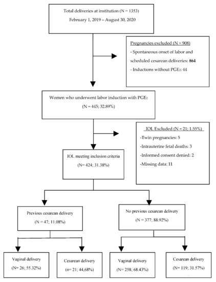 Of the total 1353 patients treated in the delivery unit of La Mancha Centro hospital between February 2019 and August 2020, 445 women underwent PGE2 (32.9%). Multiple gestations, non-cephalic presentations, antepartum fetal deaths, and those women who did not consent to participate in the study were excluded. Of the final 424 women included in the study, 47 women (11.1%) had a previous cesarean delivery, compared to 377 women without a previous cesarean section (88.9%). Figure 1 shows the flow chart of the selection process for the patients studied.