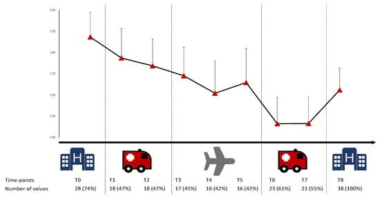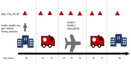 Data were retrospectively collected from medical and nursing records during the whole transport (starting ICU, mobile ICUs, and arrival ICU). Data included the location of the starting ICU, location of the arrival ICU, the duration of transport, the type of aircraft or helicopter, the type of sedative drugs, the length of stay in the arrival ICU, mortality at 7 and 30 days, socio-demographics (sex, age, height, weight, body mass index), and history of diabetes, arterial hypertension, dyslipidemia, or neoplasia. In addition, vital parameters, defined as SpO2, invasive systolic blood pressure (SBP), invasive diastolic blood pressure (DBP), invasive mean blood pressure (MBP), and heart rate (HR) were collected at each time point. For a description of time points, see Figure 1.