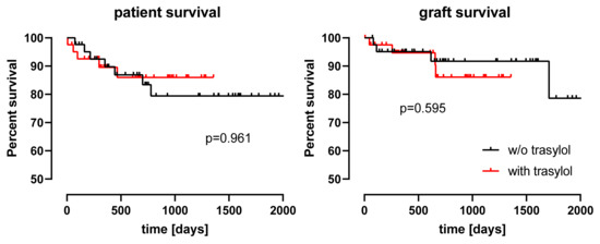 Patient survival and graft survival displayed for treatment with and without (w/o) trasylol. Patient survival (left) and graft survival (right) did not differ between 42 liver graft recipients receiving aprotinin and 42 matched controls.