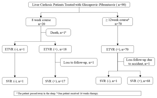 Our primary goal was to evaluate the treatment results of GLE/PIB in patients with compensated cirrhosis. We used ART HCV assays (real-time HCV and HCV genotype II, Abbott Molecular, Abbott Park, IL, USA) to quantify HCV RNA concentrations and genotyping. The end-of-treatment viral response (ETVR) was defined as an HCV RNA level lower than the lower limit of quantification (LLOQ) upon completion of the treatment course. An SVR was defined as an HCV RNA level lower than the LLOQ at 12 weeks after the last medication. The treatment period was 12 and 8 weeks for patients with compensated liver cirrhosis before and after April 2020, according to the drug label approved by Taiwan Food and Drug Administration. Virologic treatment failure was defined as either (a) non-response (HCV was detectable during and at the end of treatment); (b) relapse (HCV was undetectable at the end of treatment, but detectable during the follow-up period). The following two endpoints for viral response were evaluated: ETVR at the end of therapy and SVR after 12 weeks of antiviral therapy. The intention-to-treat group (ITT) included patients who received at least one dose of GLE/PIB, and the per-protocol group (PP) was established by excluding patients because of non-virologic failure.