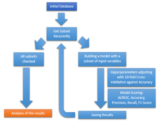 The initial database was randomly divided into two sets: training and testing, in a ratio of 80:20. At each step of the algorithm, the program constructed a subset regarding the analyzed variables in a recursive manner. The original number of variables was recursively reduced towards the optimal subset. In each algorithm loop, the program built a model based on training data and checked its effectiveness. The training set was used to find the best model hyperparameters using 10-fold cross validation against accuracy. The model was selected based on cross validation, and statistics against test data, including AUROC, accuracy, precision, recall, and F1-Score, were saved to program memory. After checking all subsets, the program sorted the results and selected the best models. Figure 1 illustrates the block diagram of the recursive algorithm allowing the development of the models.