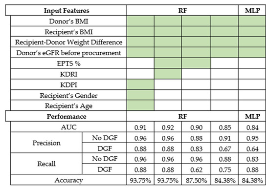 All possible subsets of the input parameters were recursively selected, with a minimum size of two parameters. The best performance was achieved by models based on at least four key parameters: donor’s BMI, recipient’s BMI, recipient–donor weight difference, and donor’s eGFR before procurement using random forest classifier and MLP with an accuracy of 84.38%. Models with fewer input variables were completely ineffective. The best models we found required the above mentioned four variables plus EPTS, KDRI, KDPI, recipient’s gender, or recipient’s age, and the result was the random forest and MLP models, which are summarized in Figure 2.