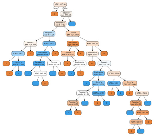 The first model is a classifier based on the random forest method. Input parameters included: donor’s BMI, recipient’s age, recipient’s gender, donor’s eGFR before procurement, KDPI, recipient–donor weight difference, and recipient’s BMI, with an accuracy of 93.75%, precision of 0.9375 and recall of 0.9375. Figure 3 illustrates the decision tree of this model.