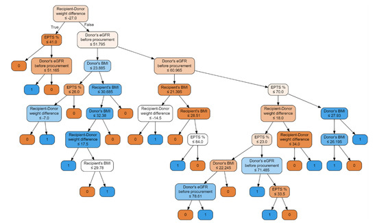 Random forest classifier with input features: donor’s BMI, donor’s eGFR before procurement, recipient–donor weight difference, recipient’s BMI, with an accuracy of 84.38%, precision of 0.8514 and recall of 0.8438. The classifier is illustrated by the decision graph in Figure 9.