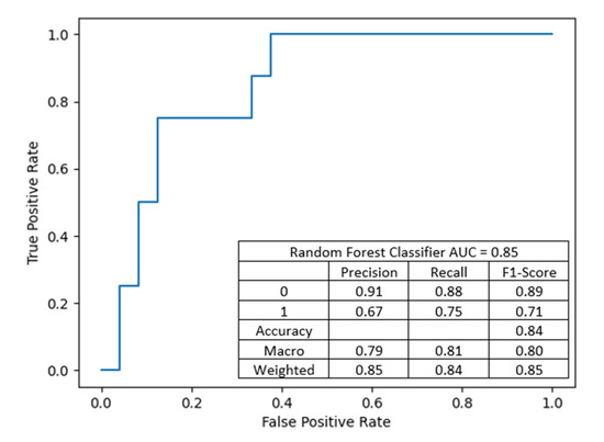 Random forest classifier with input features: donor’s BMI, donor’s eGFR before procurement, EPTS, recipient–donor weight difference, recipient’s BMI, with an accuracy of 87.50%, precision of 0.8718 and recall of 0.8750, as shown in Figure 7.