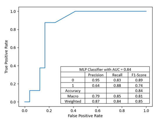 MLP with 6 neurons in first hidden layer and 37 neurons in the second, with input features: donor’s BMI, donor’s eGFR before procurement, recipient–donor weight difference, recipient’s BMI, with an accuracy of 84.38%, precision of 0.8734 and recall of 0.8438. The performance of the artificial neural network is summarized in Figure 11.