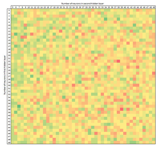 For a randomly selected testing subset, depending on the selection of hyperparameters, the number of neurons in the first layer is on the vertical axis and the number of neurons in the second layer is on the horizontal axis. Higher accuracy is marked in green, while worse is yellow and red. The best results are for an ANN with fewer neurons in the first layer and more in the second, and vice versa. On the other hand, equal-dimensional layers have a worse performance in this representation. However, this is not the subject of this analysis but instead an observation worthy of further interest.