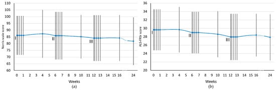 Functional scales assessment scores for the whole study group. (a) Norris scale; (b) ALS-FRSr scale. I, II, III—cell administration procedure. The results are presented as the mean values. Blue dots represent the analyzed timepoints. Vertical lines represent SD.