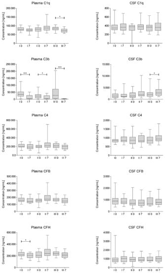Multiplex Luminex median concentration of selected complement components assessed for each cell administration (I, II, III) on day 0 and 7. CSF—cerebrospinal fluid; CFH—complement factor H; CFB—complement factor H. Significance of the changes between analyzed timepoints in comparison to day 0 of each administration was assessed using Wilcoxon signed-rank test. Level of significance—* p < 0.05, *** p < 0.001.