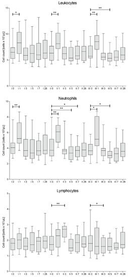 Median white blood cells count with differential into neutrophils and lymphocytes measured on days 0, 1, 3, 5, 7 and 28 for each of three cell administration procedures (I, II, III). Significance of the changes between analyzed timepoints in comparison to day 0 of each administration was assessed using Wilcoxon signed-rank test. Level of significance—* p < 0.05, ** p < 0.001.