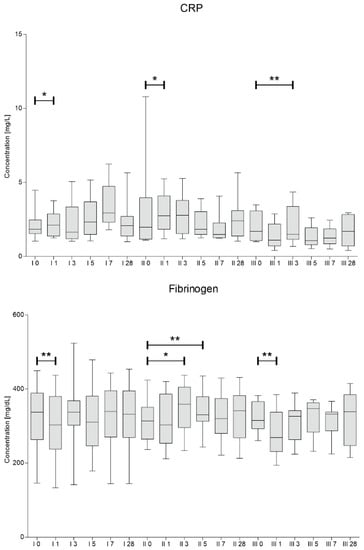 Concentrations of fibrinogen and CRP were assessed in blood samples collected at the same time points as for the analysis of blood counts. The results are presented in Figure 4.