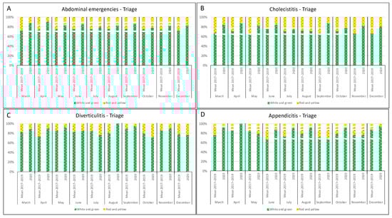 Monthly distribution of patients admitted to the ED for overall abdominal emergencies (A), cholecystitis (B), diverticulitis (C), and appendicitis (D) according to the triage classification system: comparison between the 2017–2019 period and 2020.