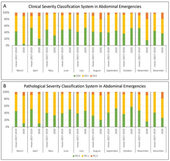 Monthly distribution of patients undergoing surgery for abdominal emergencies according to the clinical (A) and pathological (B) severity classification system: comparison between the 2017–2019 period and 2020.