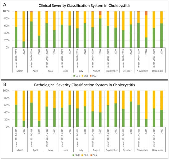 Monthly distribution of patients undergoing surgery for cholecystitis according to the clinical (A) and pathological (B) severity classification system: comparison between the 2017–2019 period and 2020.