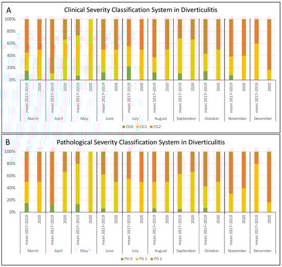 Monthly distribution of patients undergoing surgery for diverticulitis according to the clinical (A) and pathological (B) severity classification system: comparison between the 2017–2019 period and 2020.