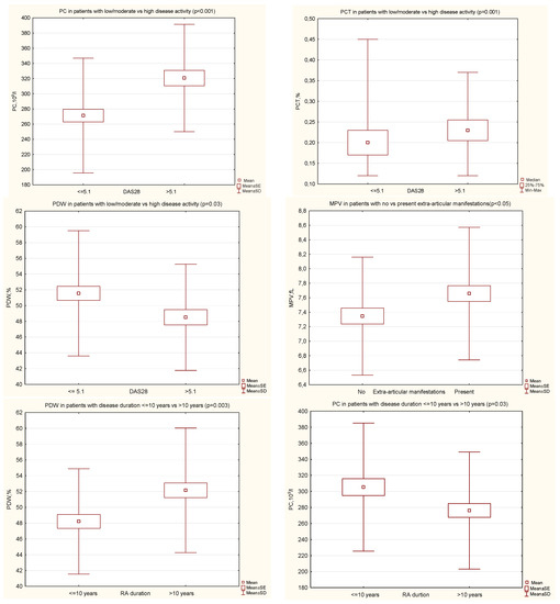 In the multiple linear regression analysis, significantly positive associations were confirmed for PC with DAS28 (b = 0.49, p = 0.02); MPV with the disease duration (b = 0.21, p = 0.02); as well as positive association for PCT with DAS28 (b = 0.57, p = 0.01) and negative with PGA (b = −0.41, p = 0.03).