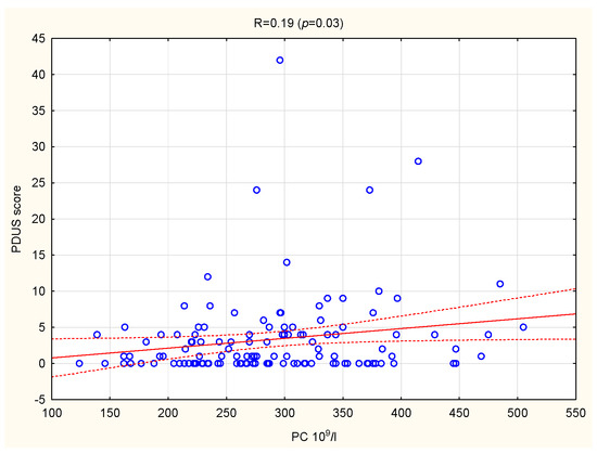 In the whole group of patients, a positive association was confirmed between PC and PDUS (R = 0.19, p = 0.03) (Figure 2). There were no other significant correlations between PIs and US parameters.