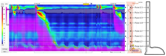 High-resolution esophageal manometry (ManoView, Sierra Scientific, Los Angeles, CA, USA) was used to assess esophageal motility patterns by measuring swallowing in the esophagus. Data were gathered at four points in the UES area and four points (point U1–U4) in the LES (points L1–L4; Figure 1). The catheter was placed to span the esophagus’ length, and the distal sensor was positioned 3 cm below the diaphragm. The patients underwent a 30-sec quiescent period for baseline data to be gathered. Each participant was given water and an edible object to swallow in a reclined position [13]. Swallowing begins with the relaxation of the UES and contraction of the LES along the esophagus’ length, and the esophageal pressure is then restored. Regular pressure patterns and reflux during swallowing are represented in Figure 1. The patients consumed 5 mL of room-temperature water 10 times and then ate the edible object five times at the same amount and temperature. The data were collected during swallowing on the average esophageal pressure at eight points dispersed along a standard pressure pattern.