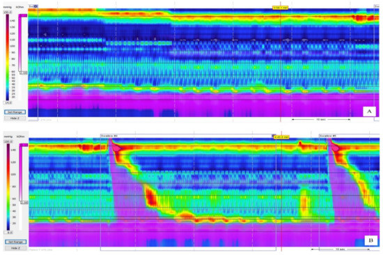 Illustration of esophageal pressure pattern during stationary (A) and swallowing (B) stages in grade D GERD.