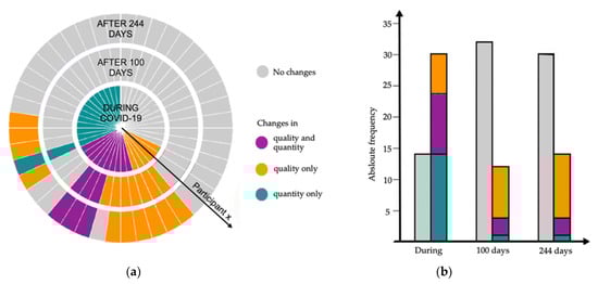 The frequencies of qualitative and quantitative alterations over the course of study are visible in Figure 2b. Table A1 shows the reported frequencies of qualitative changes (phantosmia, parosmia, and dysgeusia), quantitative changes (anosmia, hyposmia, ageusia, hypogeusia), and constellations of symptoms during COVID-19 as well as after a median of 100 and 244 days.