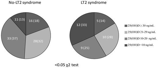 Blood samples were taken at admission, and at 3, 12, 24, 48, and 72 h after admission. After rapid centrifugation of a blood sample from an antecubital vein, free triiodothyronine (fT3) was measured immediately after the blood sample using a completely automated AIA 600 system (Tosho Corp, Tokyo, Japan), our laboratoy reference intervals being 2–4.4 ng/mL. LT3 was defined by a value of fT3 ≤ 2.2 pg/mL, occurring within 3 days of hospital admission [1]. Quantitative determination of 25-hydroxyvitamin D (25(OH)D) was performed by DiaSorin “LIAISON 25-OH Vitamin D TOTAL” CLIA, a direct competitive immunochemiluminescent assay, as we previously described in detail [17,18]. Although the gold standard for 25(OH)D measurement remains mass spectrometry, the LIAISON automated immunoassay is largely utilized in clinical laboratories, simple to use, and reliable, as LIAISON measurements have been proved to be well correlated with LC-MS-MS measurements [19].