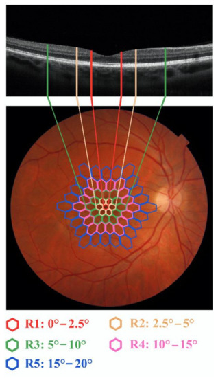 Figure 1 shows the topographical correspondence between mfERG examined areas (rings) and Sd-OCT macular scan superimposed (see below Section 2.6) on a fundus image from a Control subject.