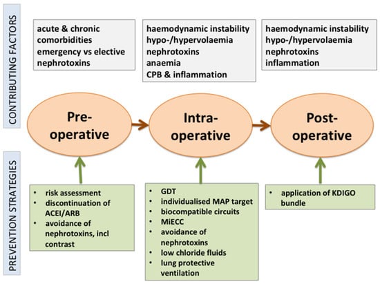 Cardiac surgery-associated AKI is common and associated with high morbidity and mortality. Strategies to prevent or mitigate this complication pre-, intra- or postoperatively are limited to general supportive measures (Figure 1). However, only a few studies have used AKI as the primary outcome, and many heterogeneous definitions of AKI were used, often lacking consensus with KDIGO criteria for AKI []. Current evidence supports a multimodal risk-stratification approach, including goal-directed perfusion, the use of biocompatible coatings during CPB, perioperative GDT, the use of balanced fluids with restricted chloride content, and biomarker-guided postoperative management of high-risk patients based on the recommendations of the KDIGO group. If AKI occurs, the transfer of information to all caregivers, medication reconciliation and patient education are essential to reduce the risk of long-term complications [].