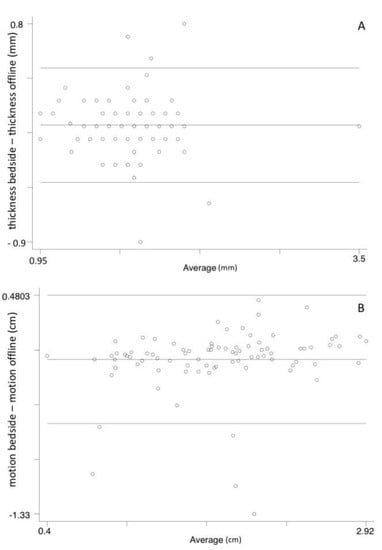 Figure 2 shows Bland–Altman plots for the comparison between bedside and offline thickness and motion. The mean difference was 0.009 mm (95% CI −0.037–0.056 mm; limits of agreement −0.436–0.455 mm) and −0.051 cm (95% CI −0.108–0.006 cm; limits of agreement −0.582–0.480 cm), respectively.