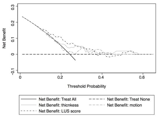 Figure 3 shows the decision curve analysis for both DUS variables and LUS scores.