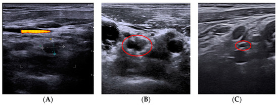 The images (A) show a lymph node recurrence to treat with laser ablation. Image (B) shows the tip of the laser fiber in the center of the lesion before the start of the ablative treatment. Image (C) shows the ultrasound follow-up at 6 months. The lymph node recurrence appears as a hypoechoic area with a hyperechoic halo (image of scarring fibrosis).