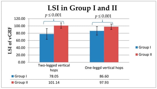 3.2. Comparison of Obtained Relative Vertical Ground Reaction Force during Two- and One-Legged Vertical Hops and Their LSI in the Between-Limb and Between-Group Analyses