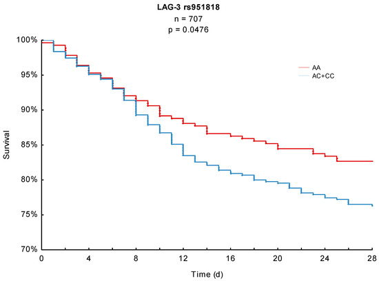 To the best of our knowledge, we present the first prospective investigation of the association between the LAG-3 rs951818 SNP and the survival of patients with sepsis. As a main result, our study revealed that LAG-3 rs951818 AA-homozygote patients had a significantly lower 28-day mortality in sepsis compared to carriers of the C-allele (17.3% vs. 23.7%, p = 0.0476). Furthermore, carriers of the AA-genotype at this position also presented a better long-term survival in the observation period of 90 days (28.2%) compared to carriers of the C-allele (33.5%); this finding was, however, not statistically significant (p = 0.1069).