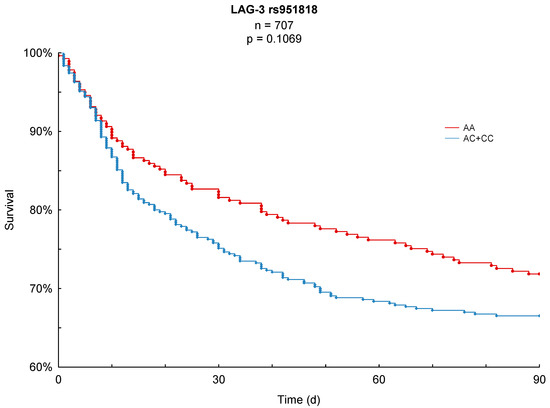 Kaplan–Meier 90-day survival analysis with respect to the LAG-3 rs951818 SNP.