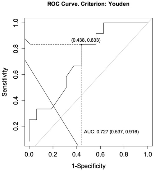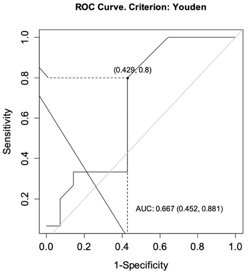 The ROC curves were drawn for each group to determine the optimal cut-off points for CT-P13 level as predictors of achieving a primary response while ensuring no secondary loss of response. For CD, the analysis showed an area under the curve (AUC) = 0.727, CI95 [0.537; 0.916] indicating satisfactory differentiation of patients by the selected diagnostic test. The optimal cut-off point for infliximab at week 14 was calculated to be 4.60 μg/mL. The sensitivity of the analysis was 83%, specificity 56%, and test accuracy 68% (Figure 2). For UC patients, the same analysis showed AUC = 0.667, CI95 [0.452; 0.881] and the optimal cut-off point for CT-P13 at week 14 was calculated to be 3.10 μg/mL. The sensitivity of the analysis was 80%, specificity 57%, and test accuracy 69% (Figure 3).